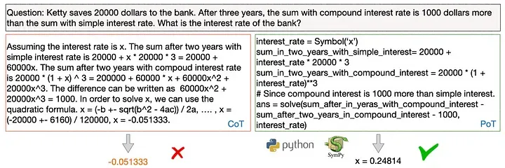 - 数学和金融领域:研究表明,PoT 在数学问题(如 GSM8K、AQuA 等数据集)和金融问题(如 FinQA、ConvFinQA 等数据集)上,相较于传统的思维链(CoT)方法,表现出更高的准确性。