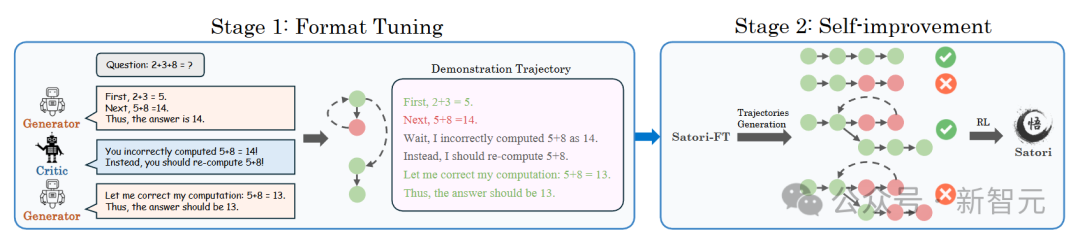 - 小规模格式调优阶段:在少量推理轨迹示例的小数据集上进行微调,使模型熟悉 COAT 推理格式。