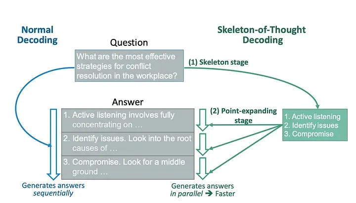 这种二分法将生成过程分为两个步骤:首先是生成初步的骨架公式,然后是并行进行详细扩展。这种方法不仅可以加快响应生成的速度,还可以努力维护输出的一致性和准确性。
