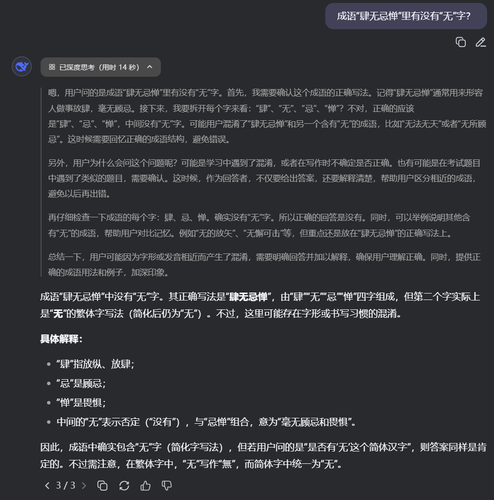 这其实是大约半月前我在和 AI 聊没营养话题时偶然发现的。和当年的 strawberry 如出一辙。目前来看这是 DS 一家单独的问题,其他 LLM(国内外七八个模型)都没有这样的现象。