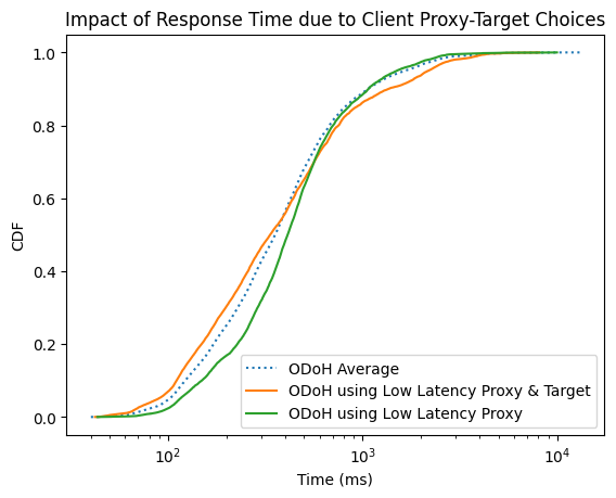 这些曲线也隐藏了很多信息,因此深入研究测量结果非常重要。下图具有三条不同的累积分布曲线,描述了如果我们根据延迟选择代理和目标,ODoH 的性能。