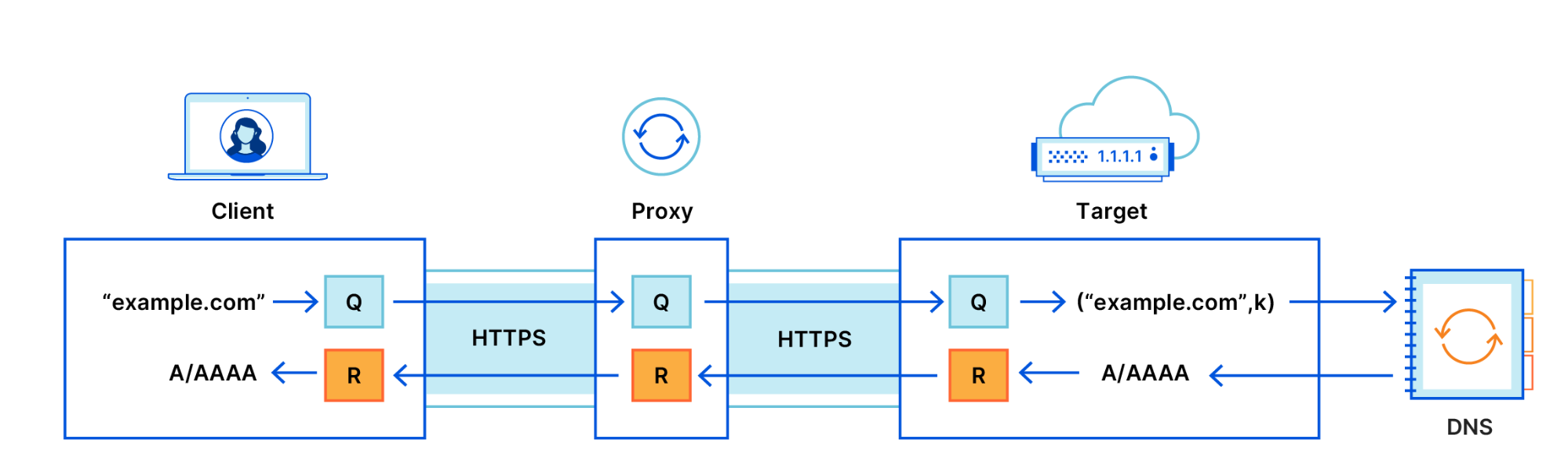 客户端通过 HTTPS 连接将这些加密的查询传输到代理。 收到后,代理将查询转发到指定的目标。