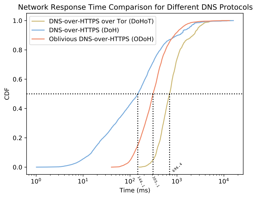 下图显示了 DoH、ODoH 以及通过 Tor 网络传输的 DoH 的查询/响应时间的累积分布。从左侧 0.5 开始的虚线水平线是 50% 的标记线。沿着这条水平线,对于任何绘制的曲线,曲线在虚线下方的部分是 50% 的数据点。现在看 x 轴,它是时间的度量。出现在左侧的线比右侧的线更快。最后一个重要的细节是 x 轴以对数刻度绘制。这意味着什么?请注意,在累积分布图中,标记之间的距离(10 倍)是相等的,但“x”是指数,代表数量级。因此,虽然前两个标记之间的时间差为 9 毫秒,但第 3 个和第 4 个标记之间的差异为 900 毫秒。